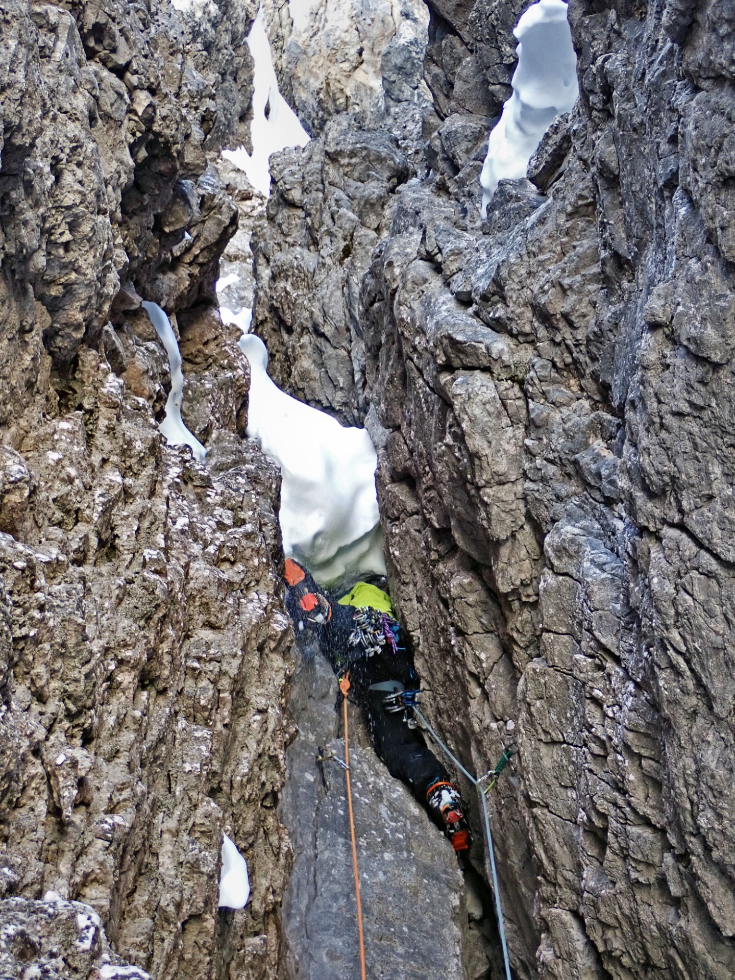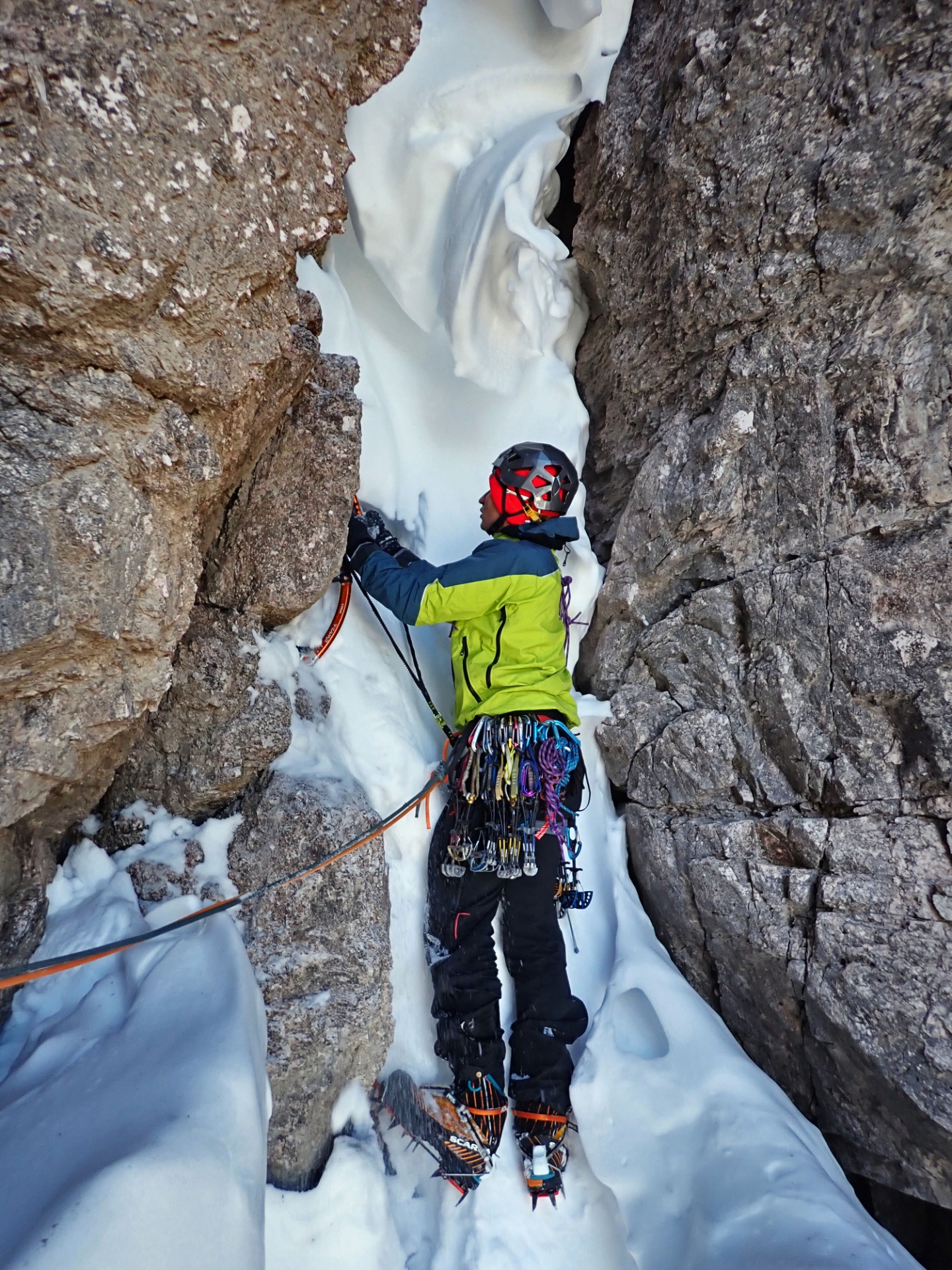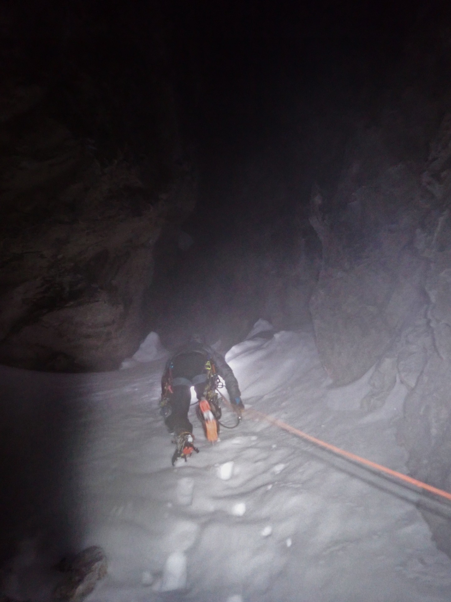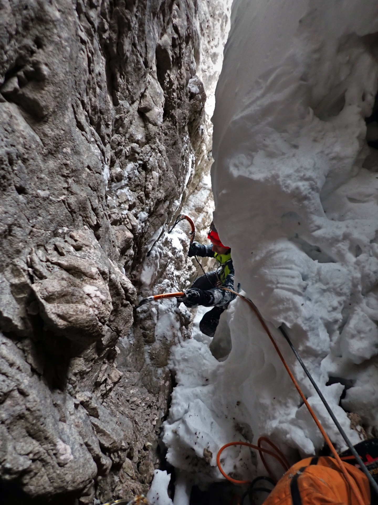 La via corre per tutti i 1.200 metri dentro un grande camino, dunque è una linea logicissima. Il camino è caratterizzato da innumerevoli funghi di neve, superare quelli più grossi è stata una sfida realmente problematica e inoltre il continuo scavare dentro questi tappi nevosi ci ha resi bagnati fradici, ecco perché era davvero impensabile bivaccare.