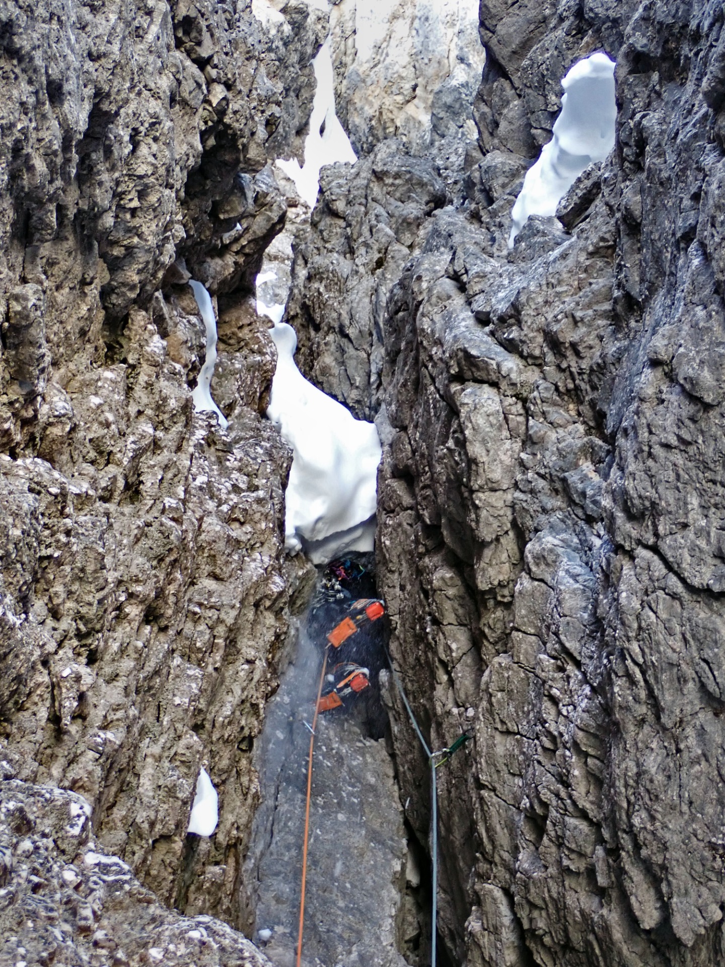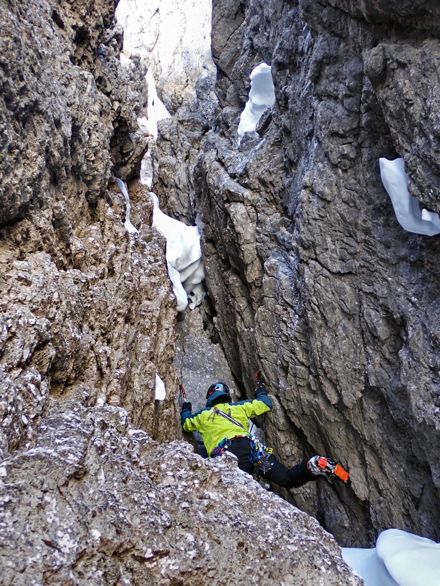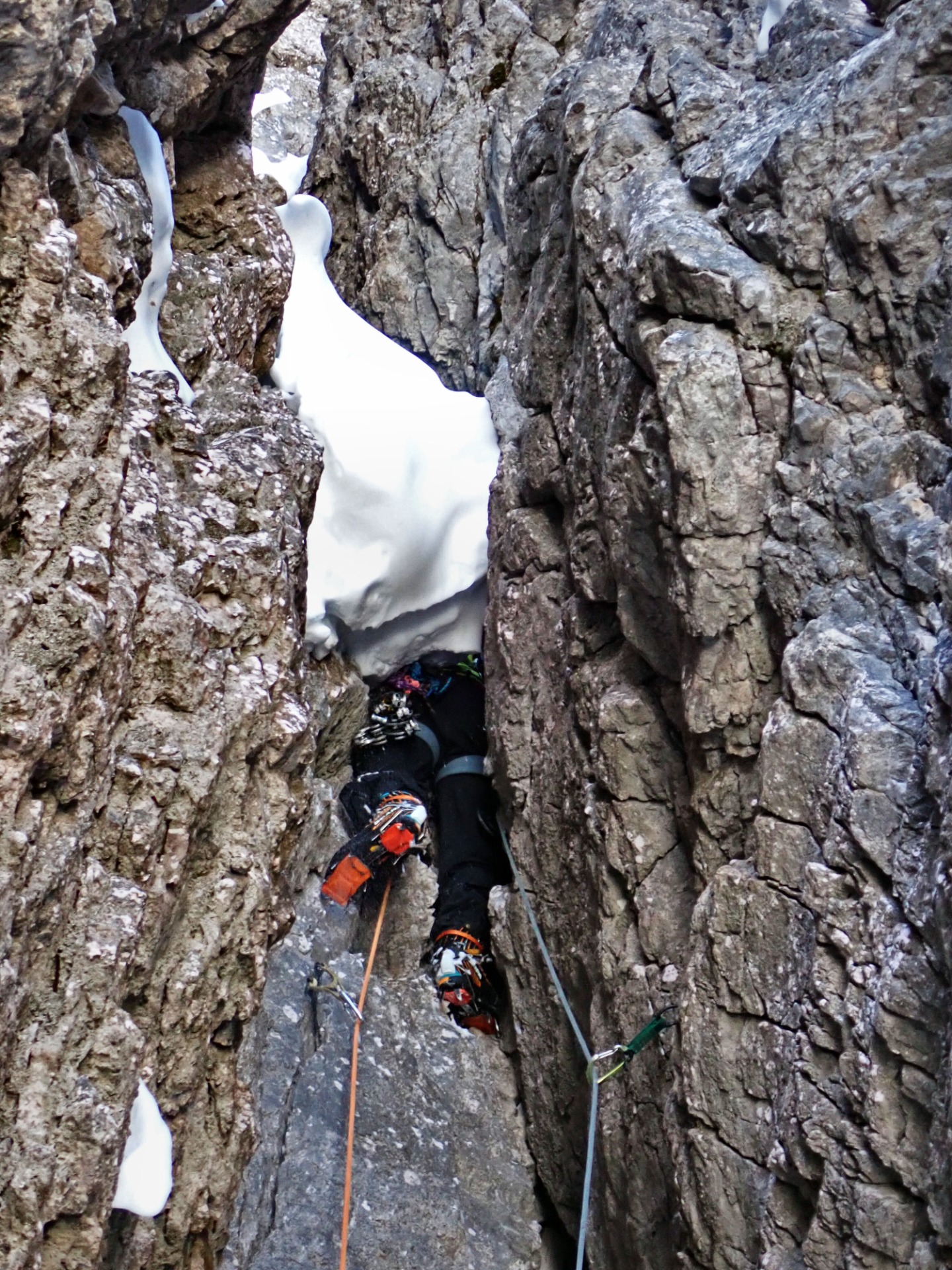 La via corre per tutti i 1.200 metri dentro un grande camino, dunque è una linea logicissima. Il camino è caratterizzato da innumerevoli funghi di neve, superare quelli più grossi è stata una sfida realmente problematica e inoltre il continuo scavare dentro questi tappi nevosi ci ha resi bagnati fradici, ecco perché era davvero impensabile bivaccare.