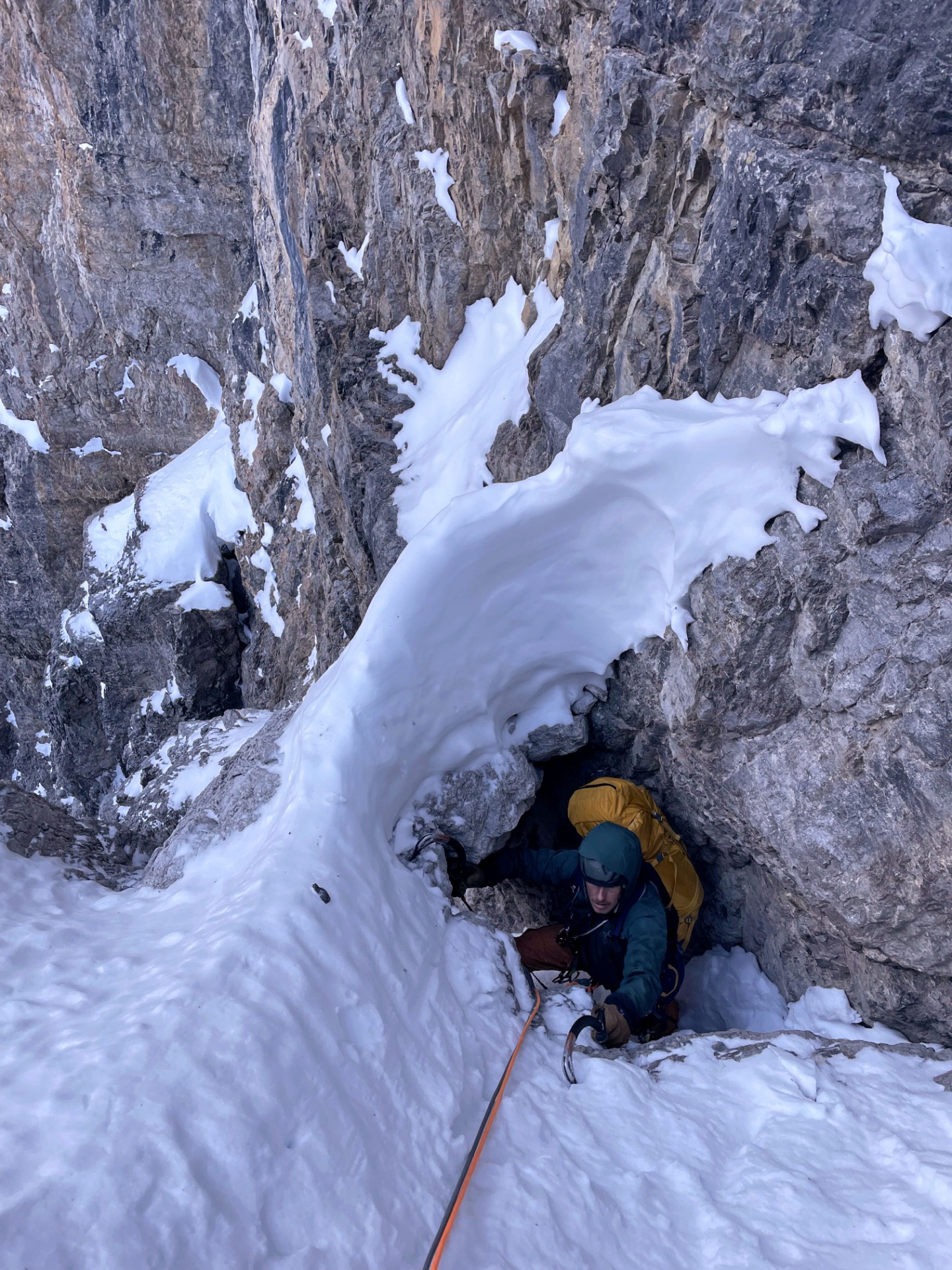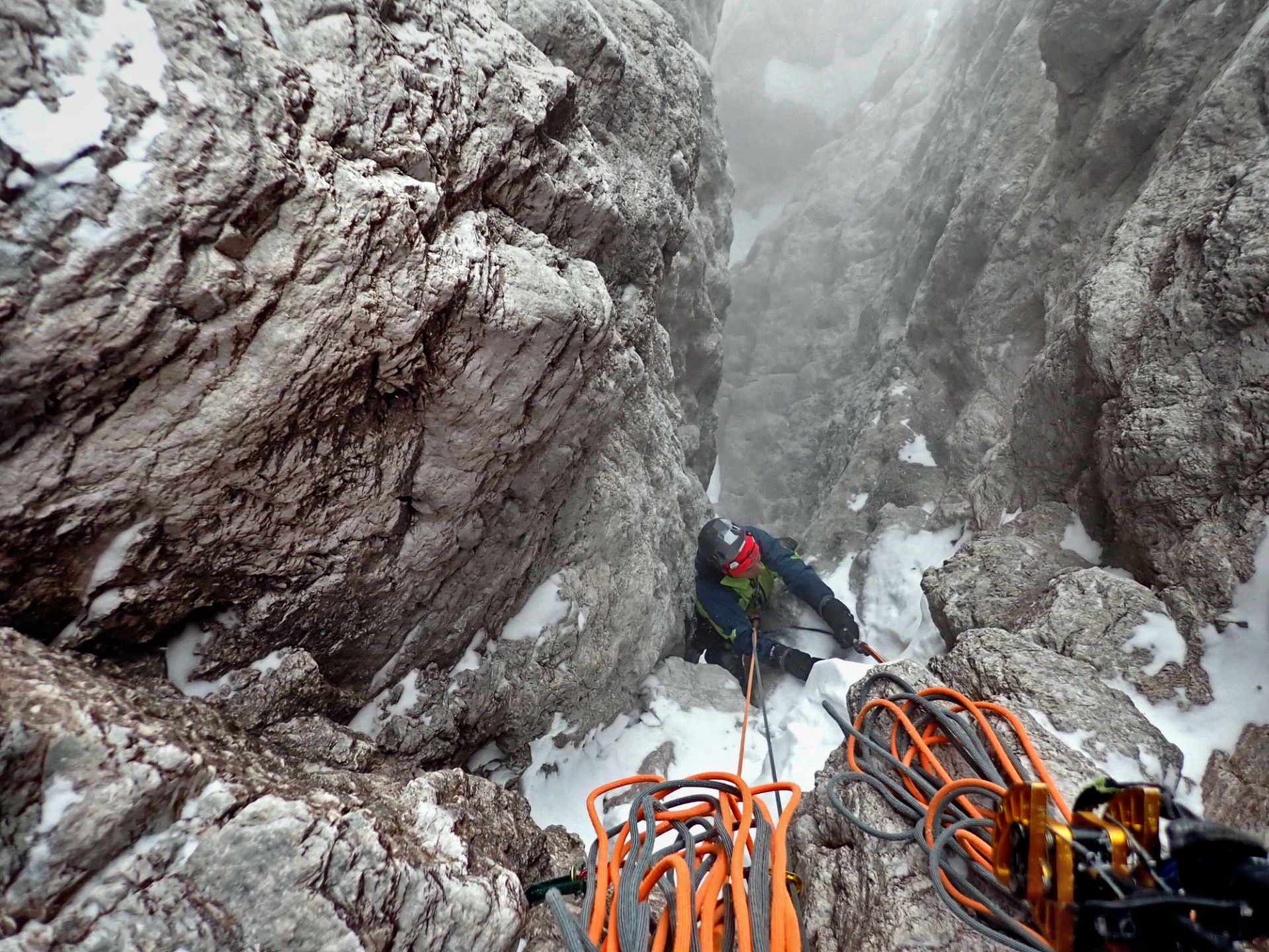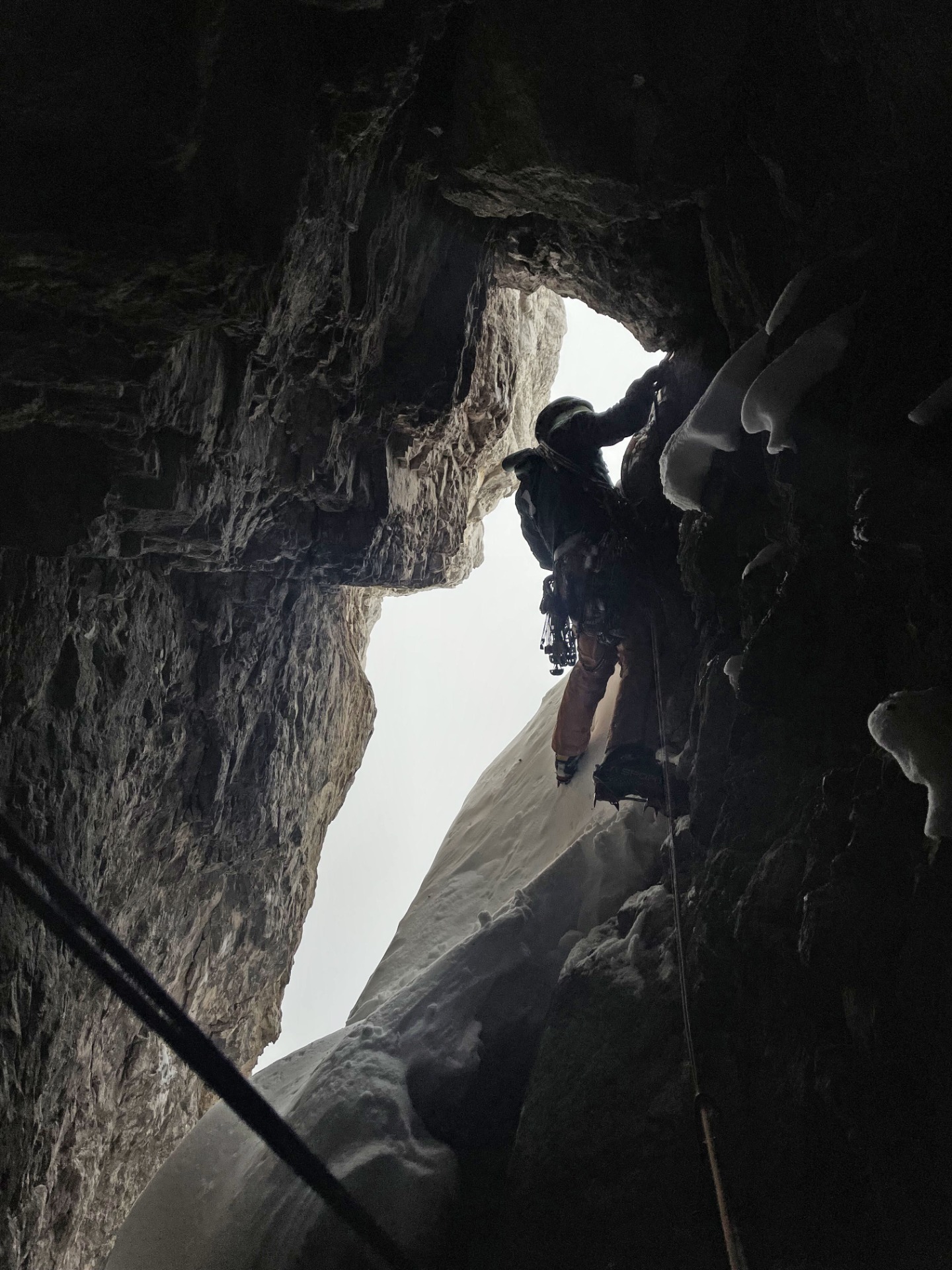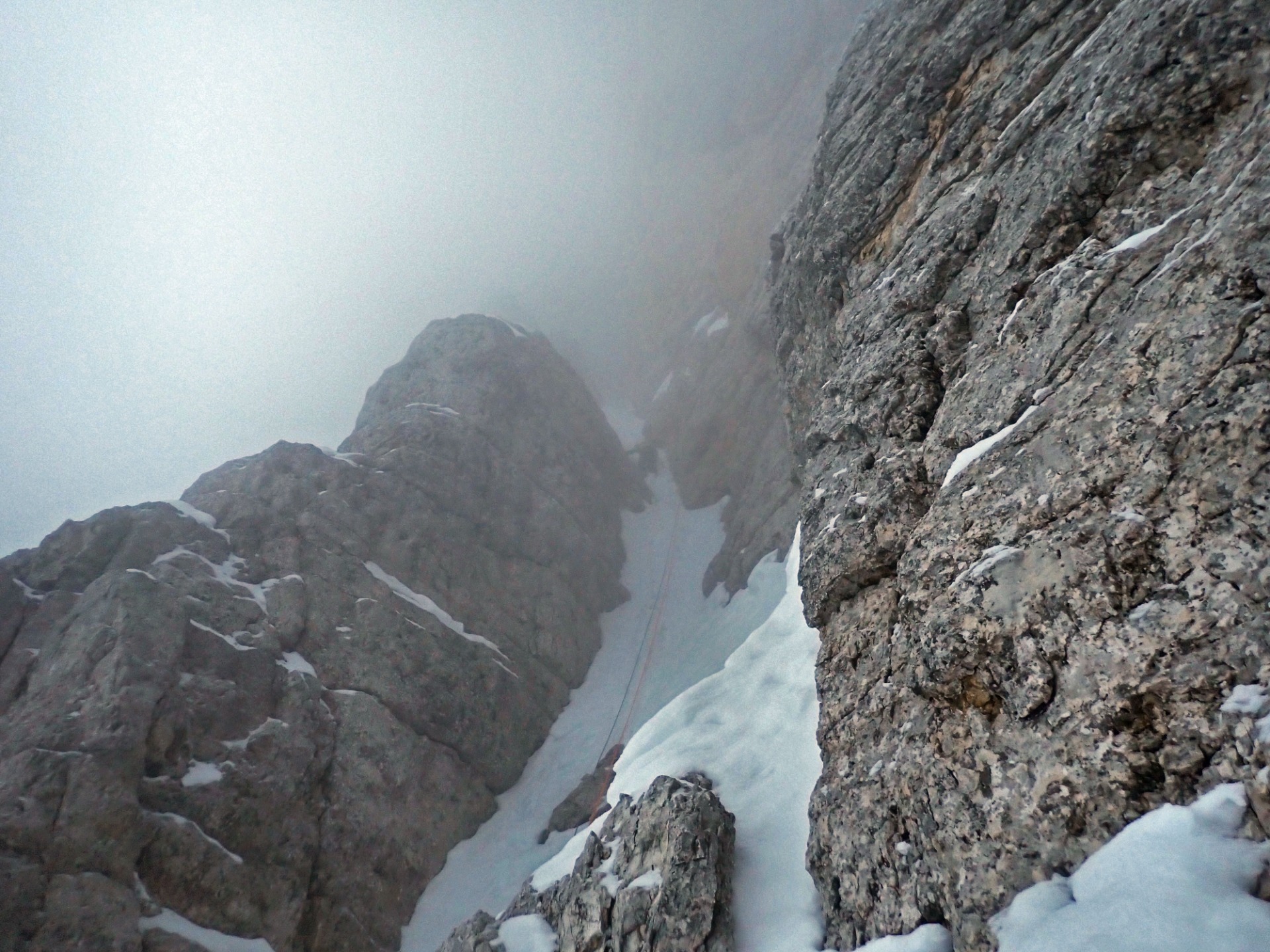 La via corre per tutti i 1.200 metri dentro un grande camino, dunque è una linea logicissima. Il camino è caratterizzato da innumerevoli funghi di neve, superare quelli più grossi è stata una sfida realmente problematica e inoltre il continuo scavare dentro questi tappi nevosi ci ha resi bagnati fradici, ecco perché era davvero impensabile bivaccare.