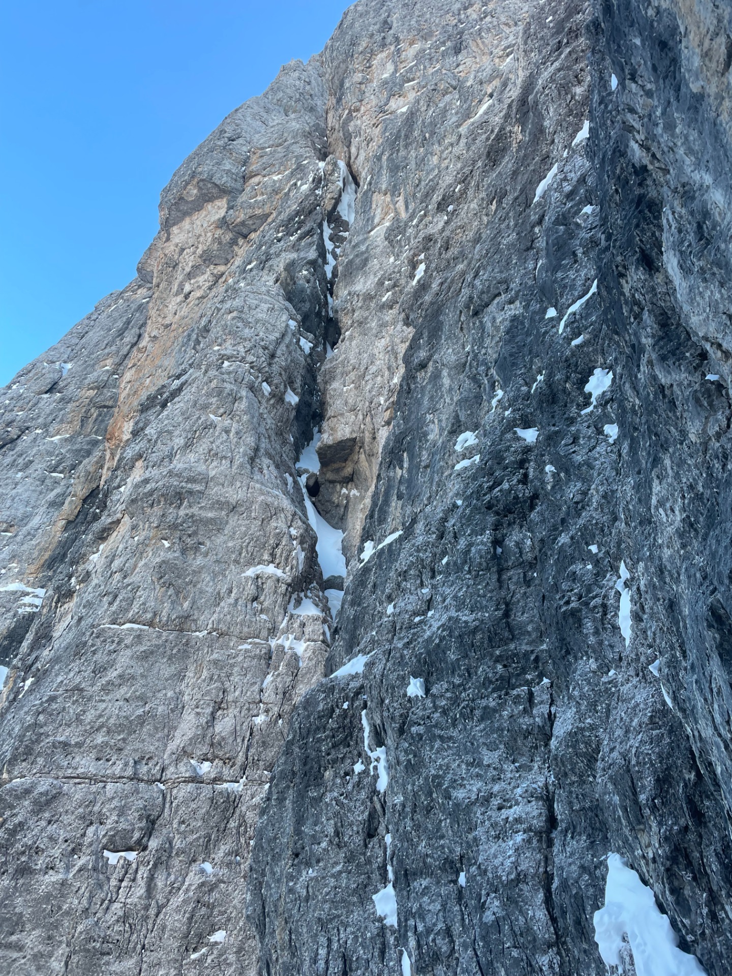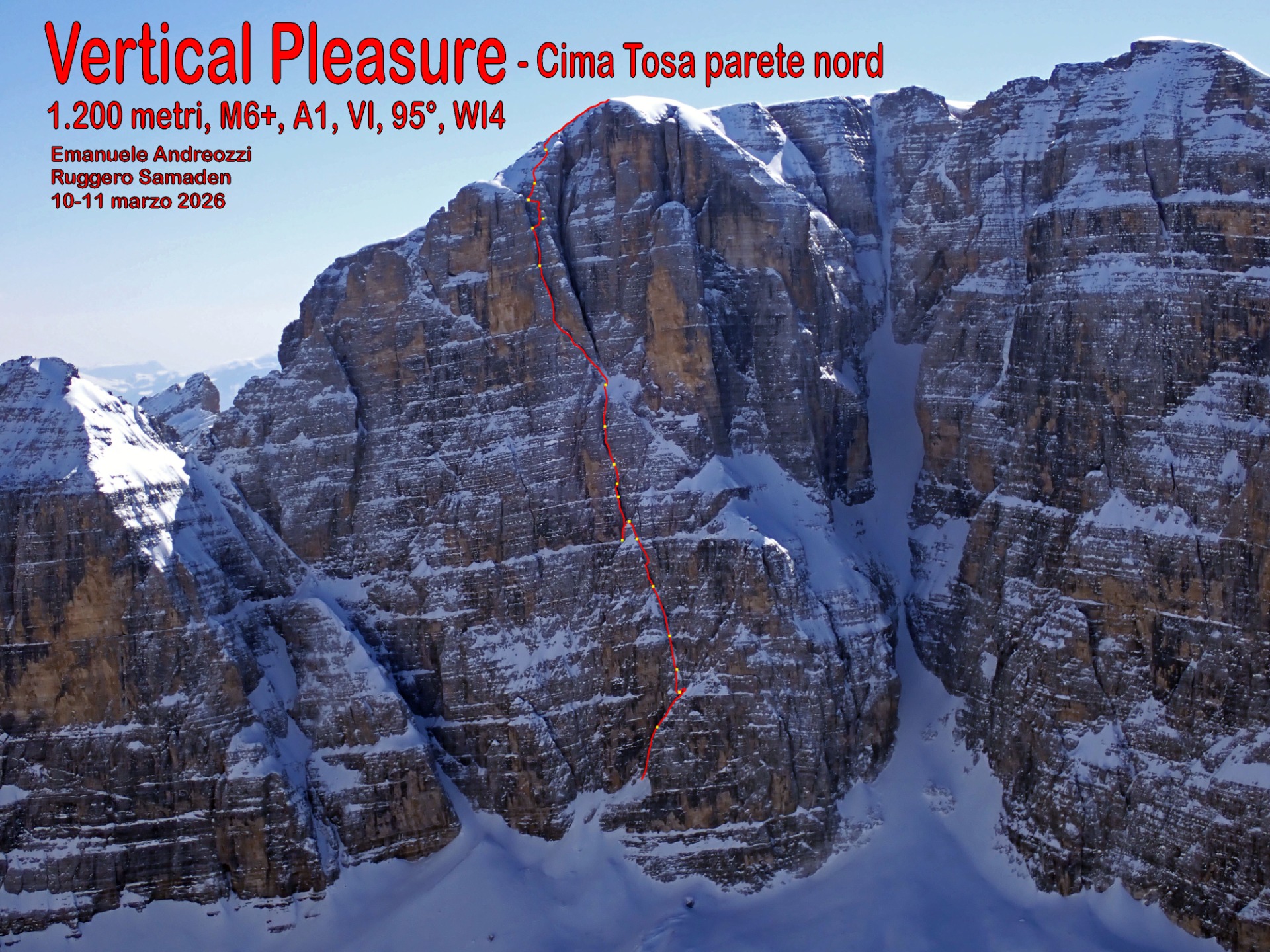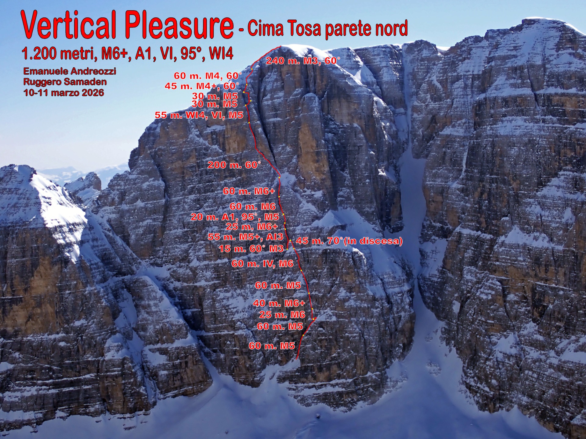 Il 10 e l'11 marzo 2026 con Ruggero Samaden abbiamo aperto questa nuova via sulla parete nord-est di Cima Tosa in un unico slancio di oltre 24 ore di arrampicata no stop, distribuiti nell'arco di due giorni. Due settimane prima avevamo fatto un tentativo, nel quale era emersa l'impossibilità di bivaccare a causa dei nostri indumenti completamente fradici, motivo per cui abbiamo poi deciso di riprovarci scalando senza fermarci giorno e notte.