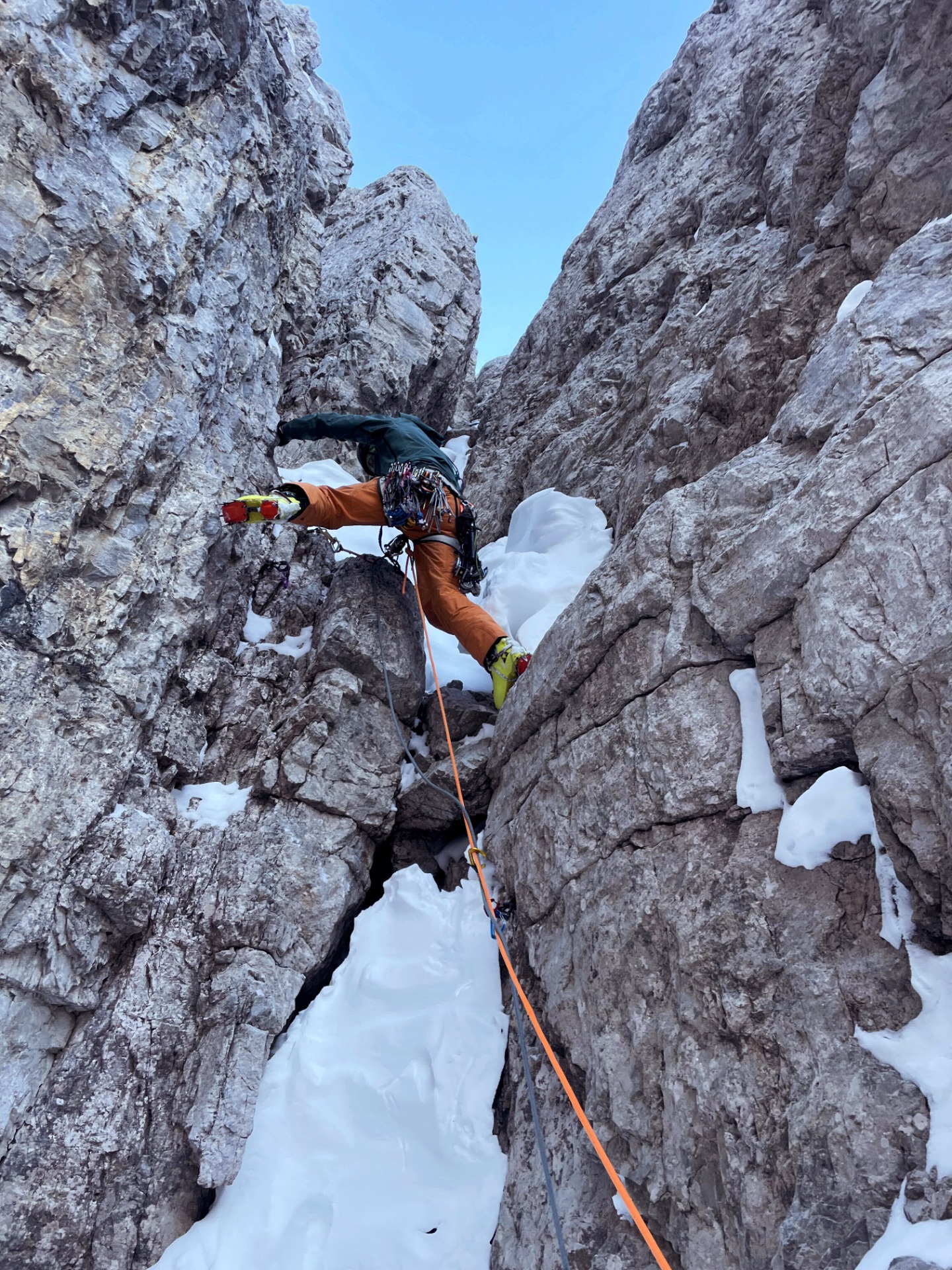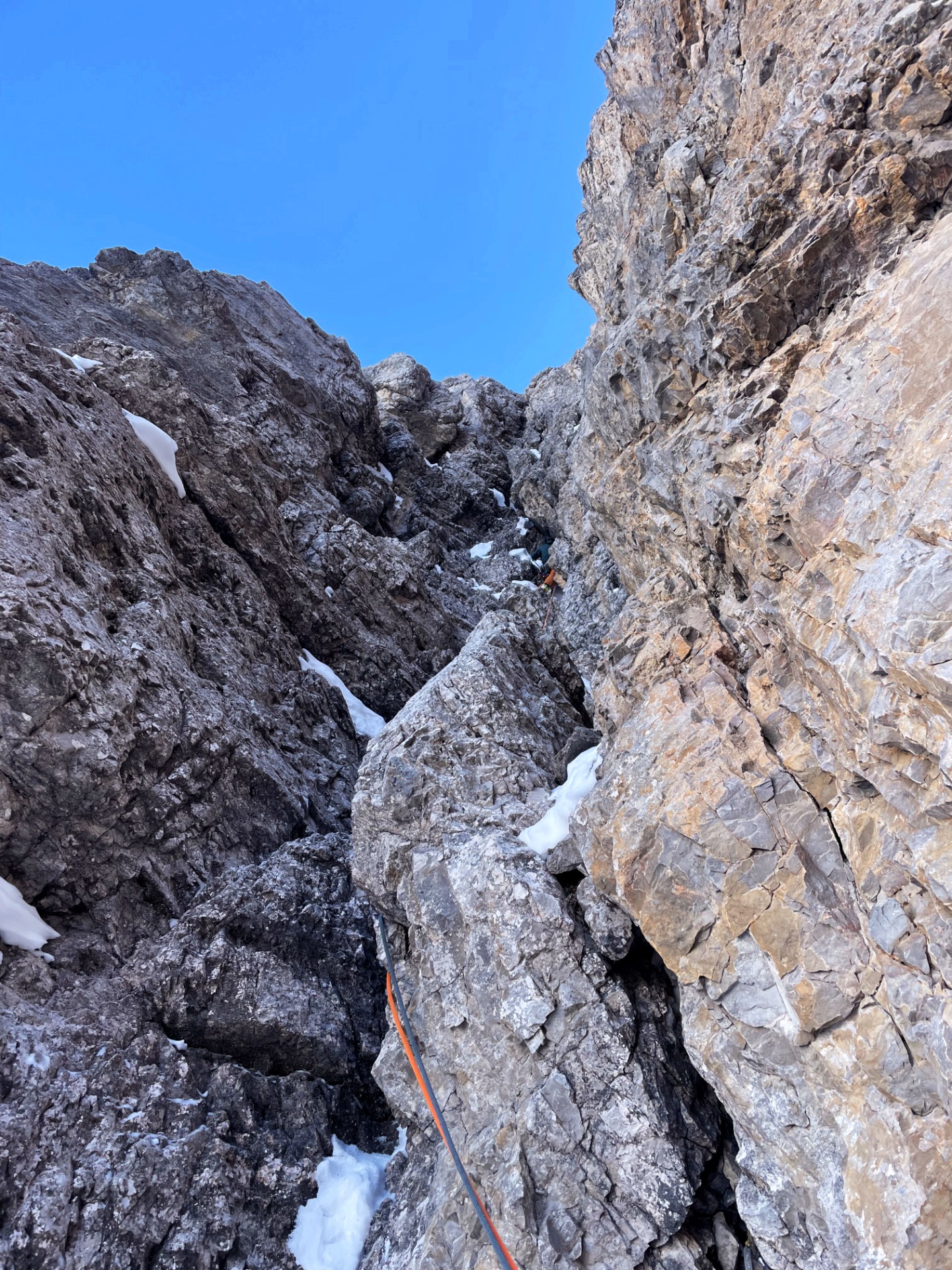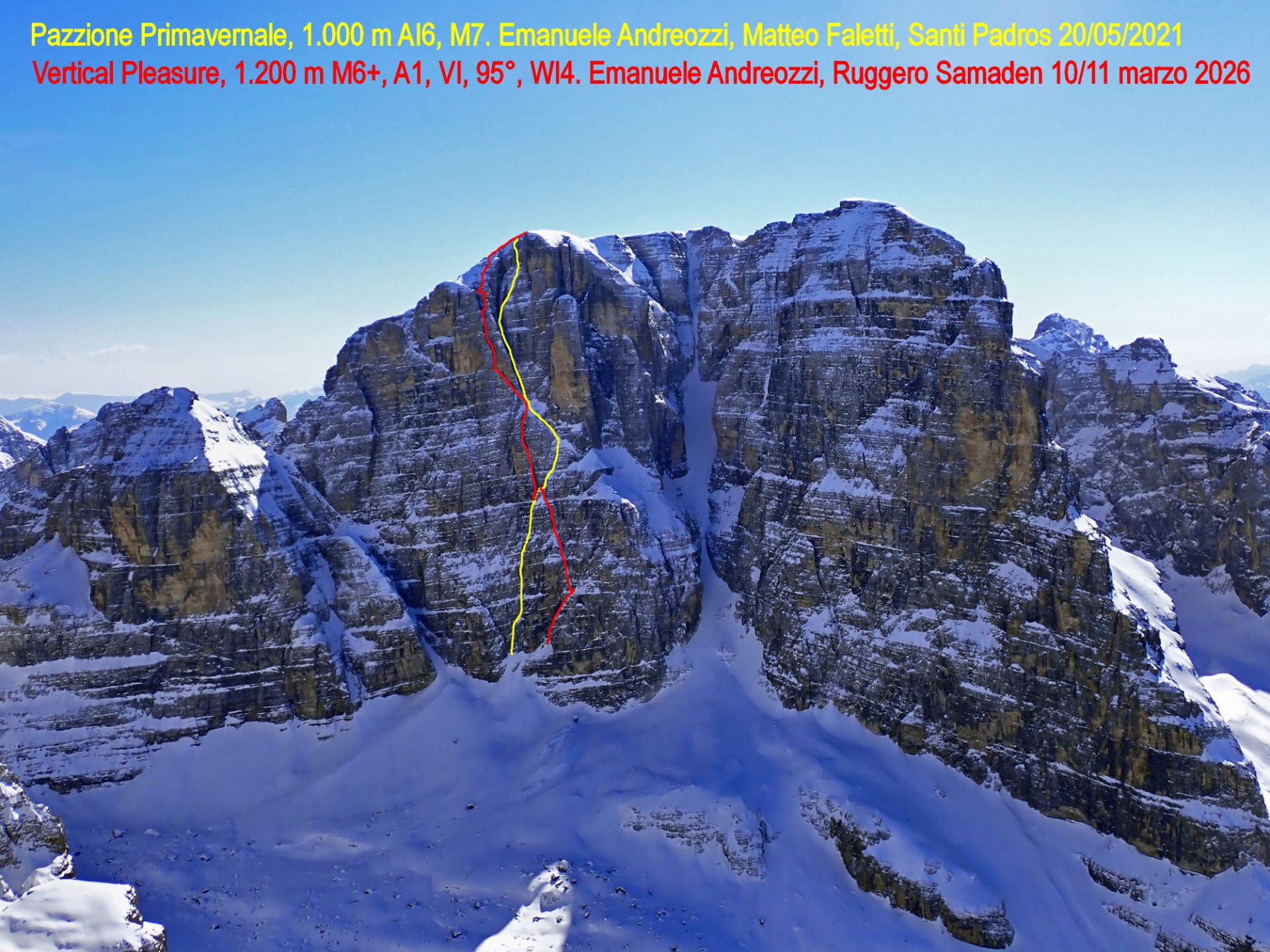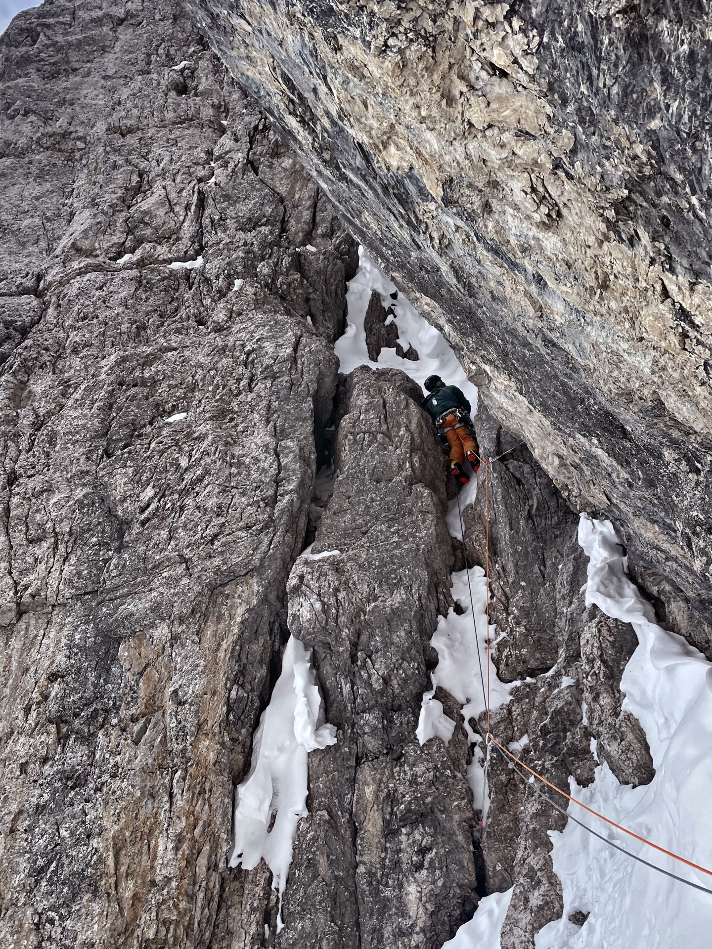 Il 10 e l'11 marzo 2026 con Ruggero Samaden abbiamo aperto questa nuova via sulla parete nord-est di Cima Tosa in un unico slancio di oltre 24 ore di arrampicata no stop, distribuiti nell'arco di due giorni. Due settimane prima avevamo fatto un tentativo, nel quale era emersa l'impossibilità di bivaccare a causa dei nostri indumenti completamente fradici, motivo per cui abbiamo poi deciso di riprovarci scalando senza fermarci giorno e notte.