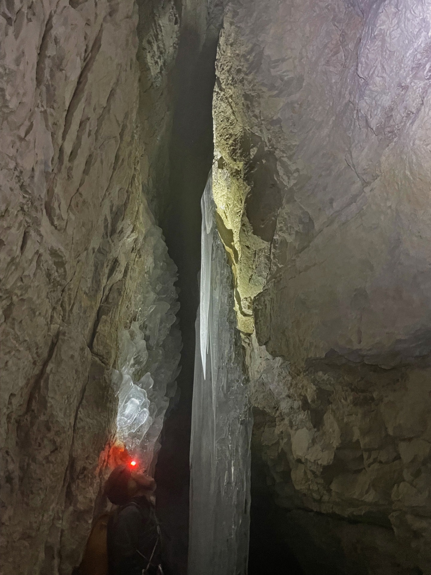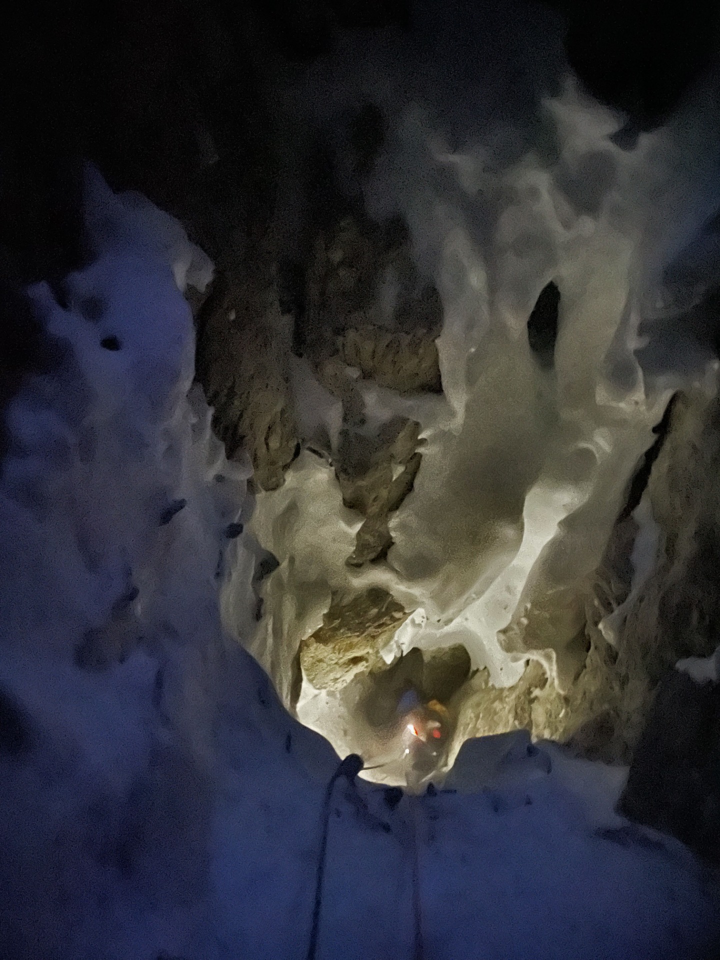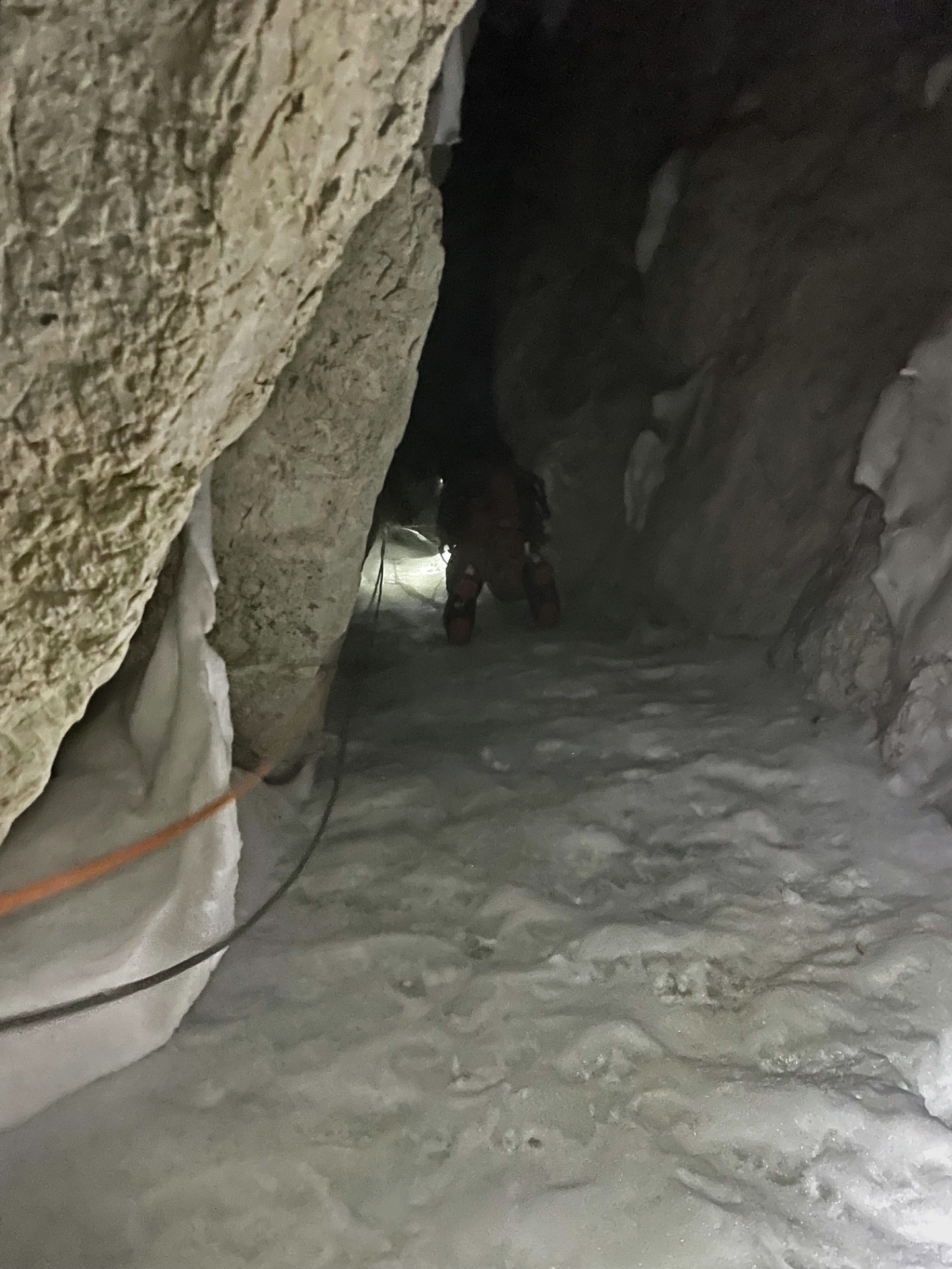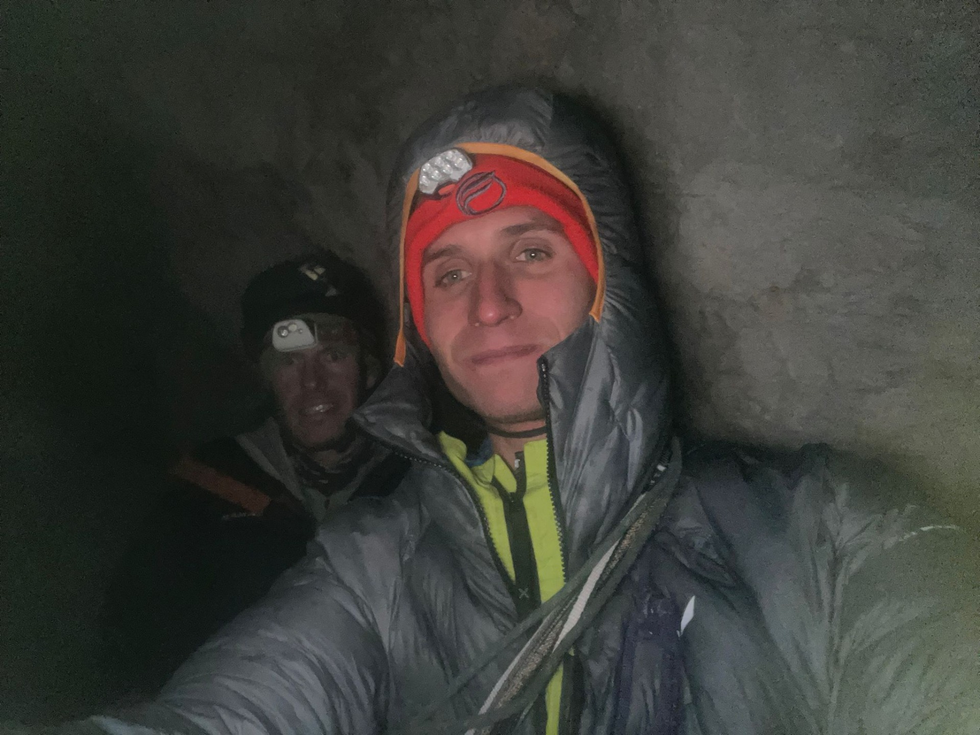 Quando eravamo giunti quasi all'uscita del camino e l'ascesa ormai sembrava cosa fatta, un enorme grotta ci ha sbarrato totalmente la strada; al buio e nella nebbia abbiamo dovuto cercare una via d'uscita sulla parete destra dell'enorme camino. Ciò ha richiesto ancora svariate ore di arrampicata in condizioni critiche e prolungato di molto l'ascesa.
