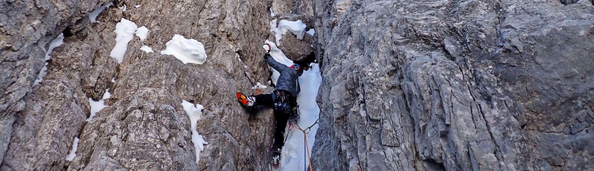 1.200 metri di sviluppo; M6+, A1, VI, 95°, WI4.
