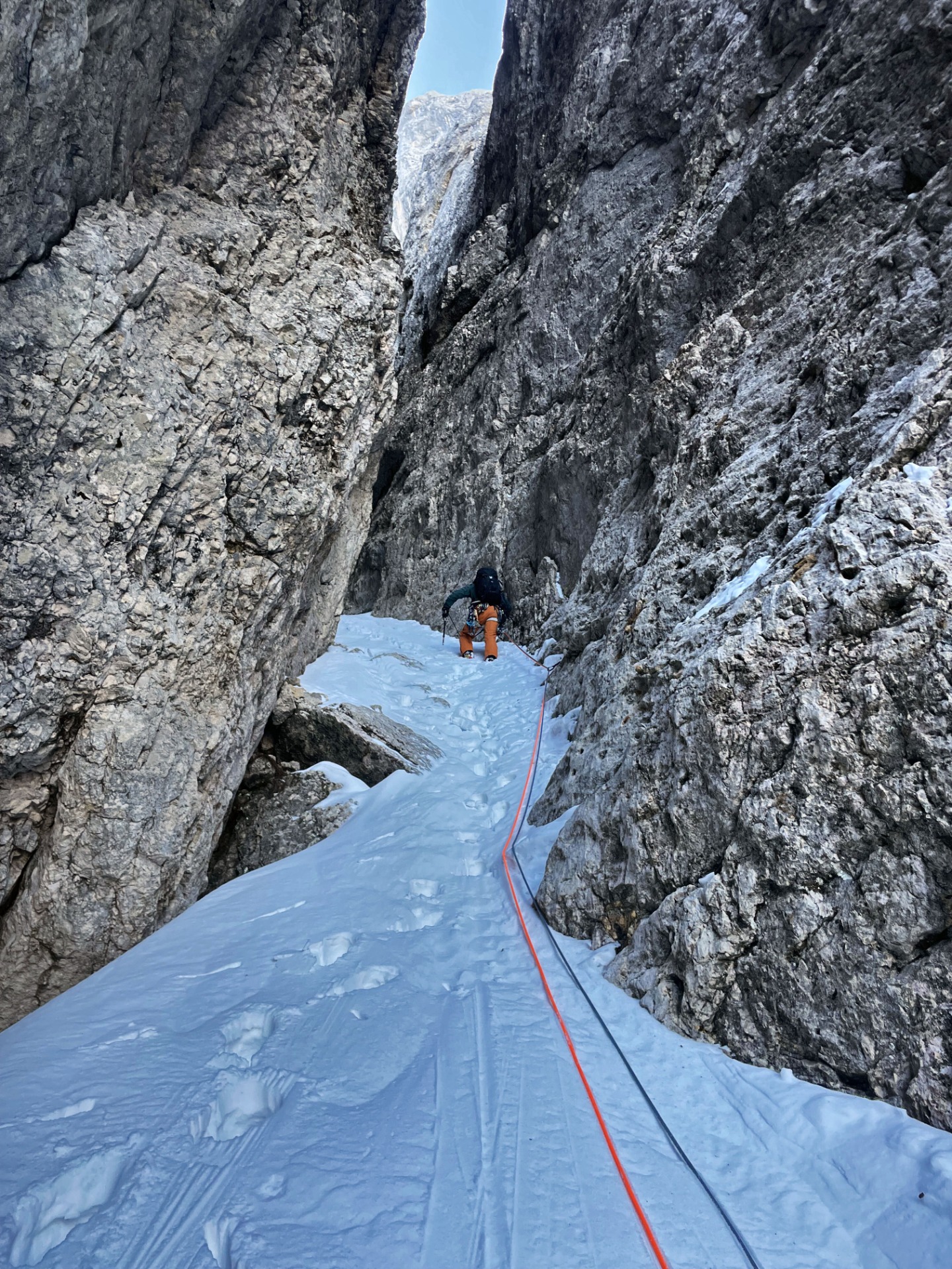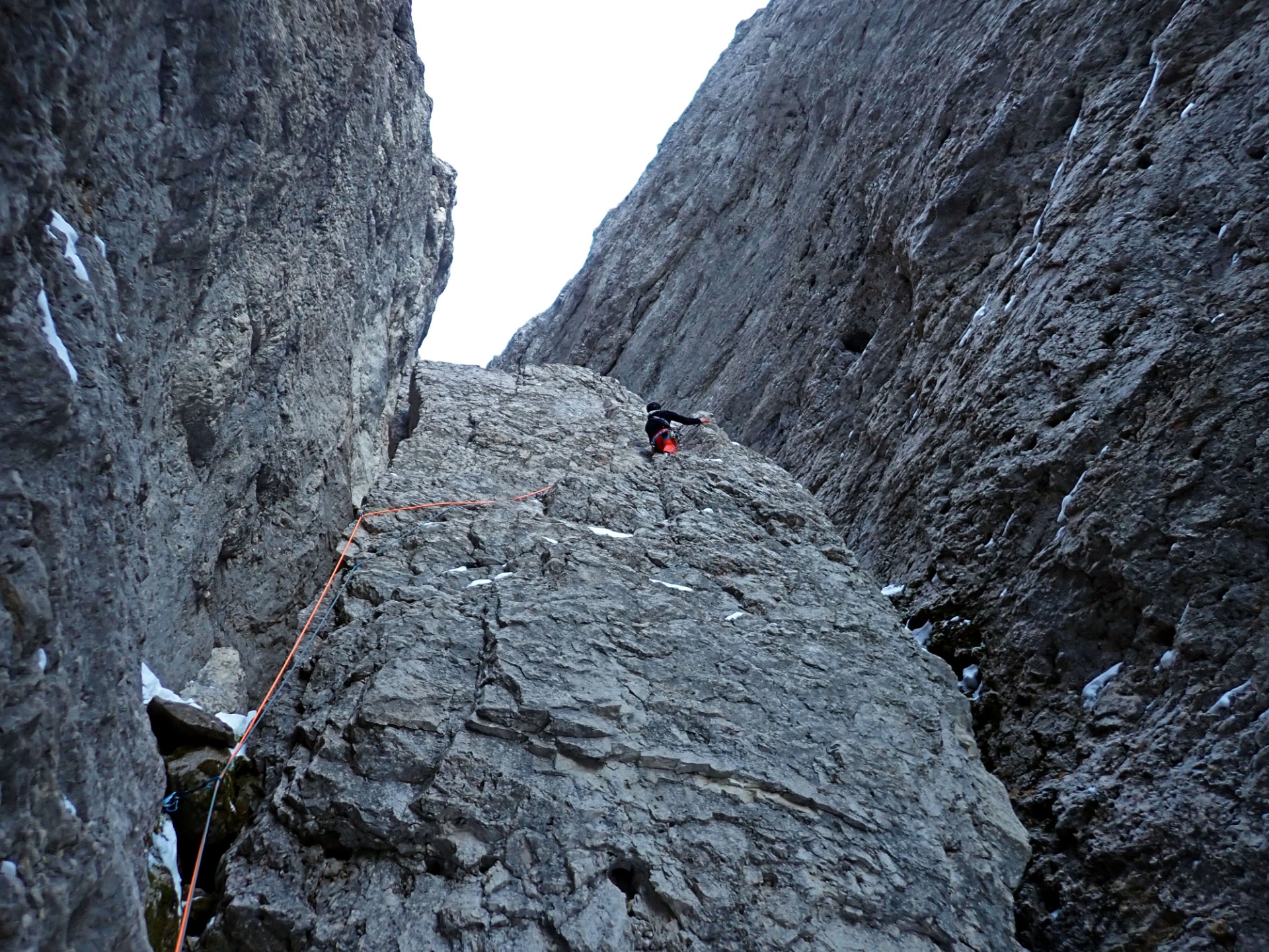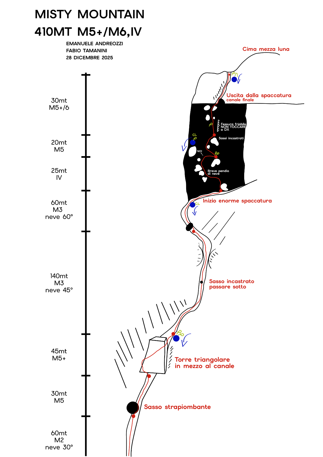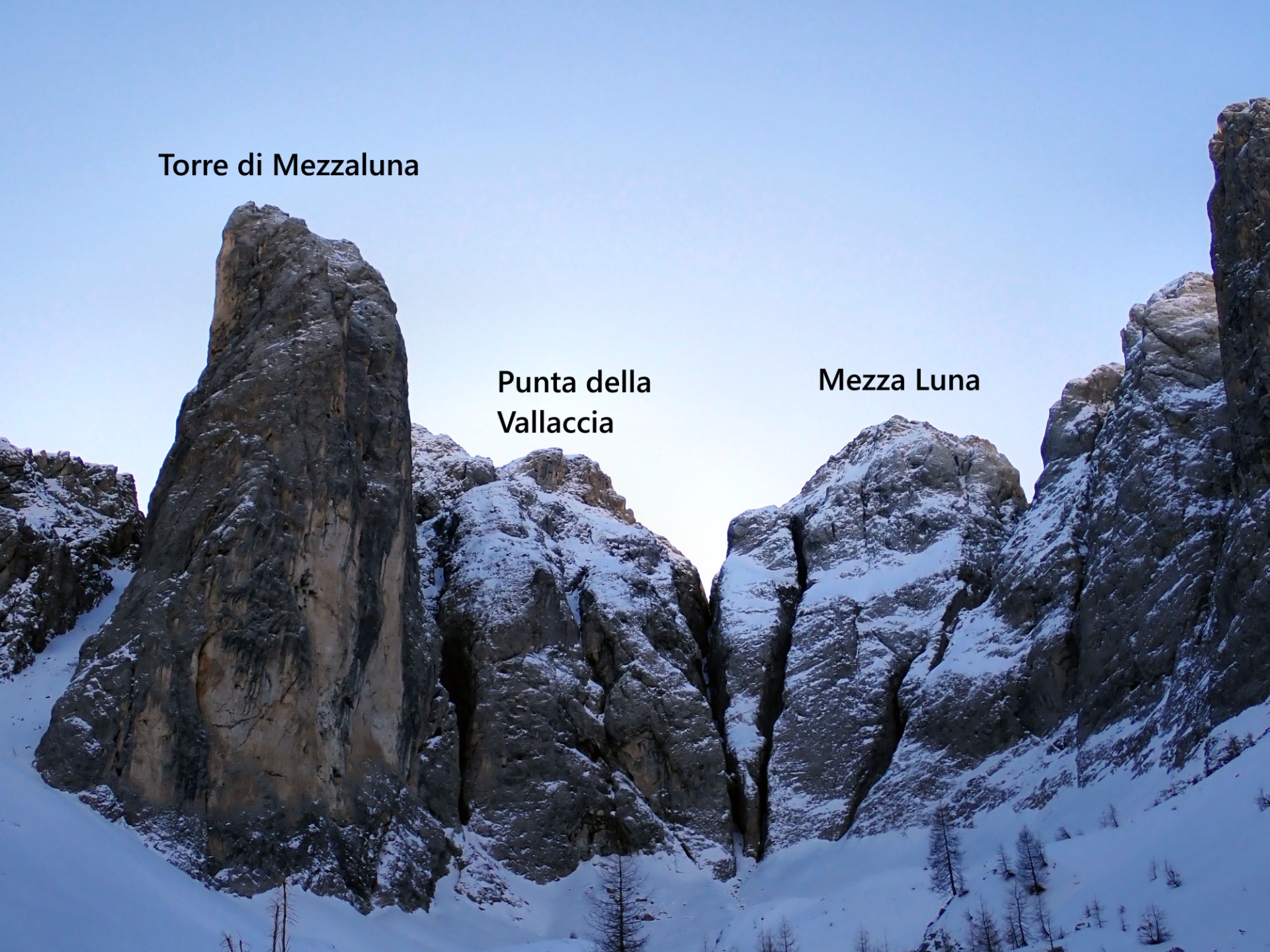 Il 28 dicembre 2025 con Fabio Tamanini abbiamo aperto questa nuova via sulla parete nord della Mezza Luna, in Vallaccia. Questa vetta semisconosciuta, non è da confondere con la più nota ed elegante Torre di Mezzaluna, che si trova appena lì vicino. A separare la Torre di Mezzaluna con la Mezza Luna c'è la Punta della Vallaccia(vedi foto sotto). A seguito di accurate e non facili ricerche, siamo riusciti a trovare un unico altro itinerario su questa parete nord, aperta il 26 giugno 1927 da Harm, Paula Wiesinger e Spinger per un imprecisata via di circa 350 metri su roccia friabile di III grado (fonte libro Andare per monti, "Bepi" Pellegrinon 1979). In letteratura non sono riportate altre salite, dunque la nostra ascesa di Misty Mountain è stata effettuata quasi un secolo dopo la prima ed unica altra via aperta sulla parete.