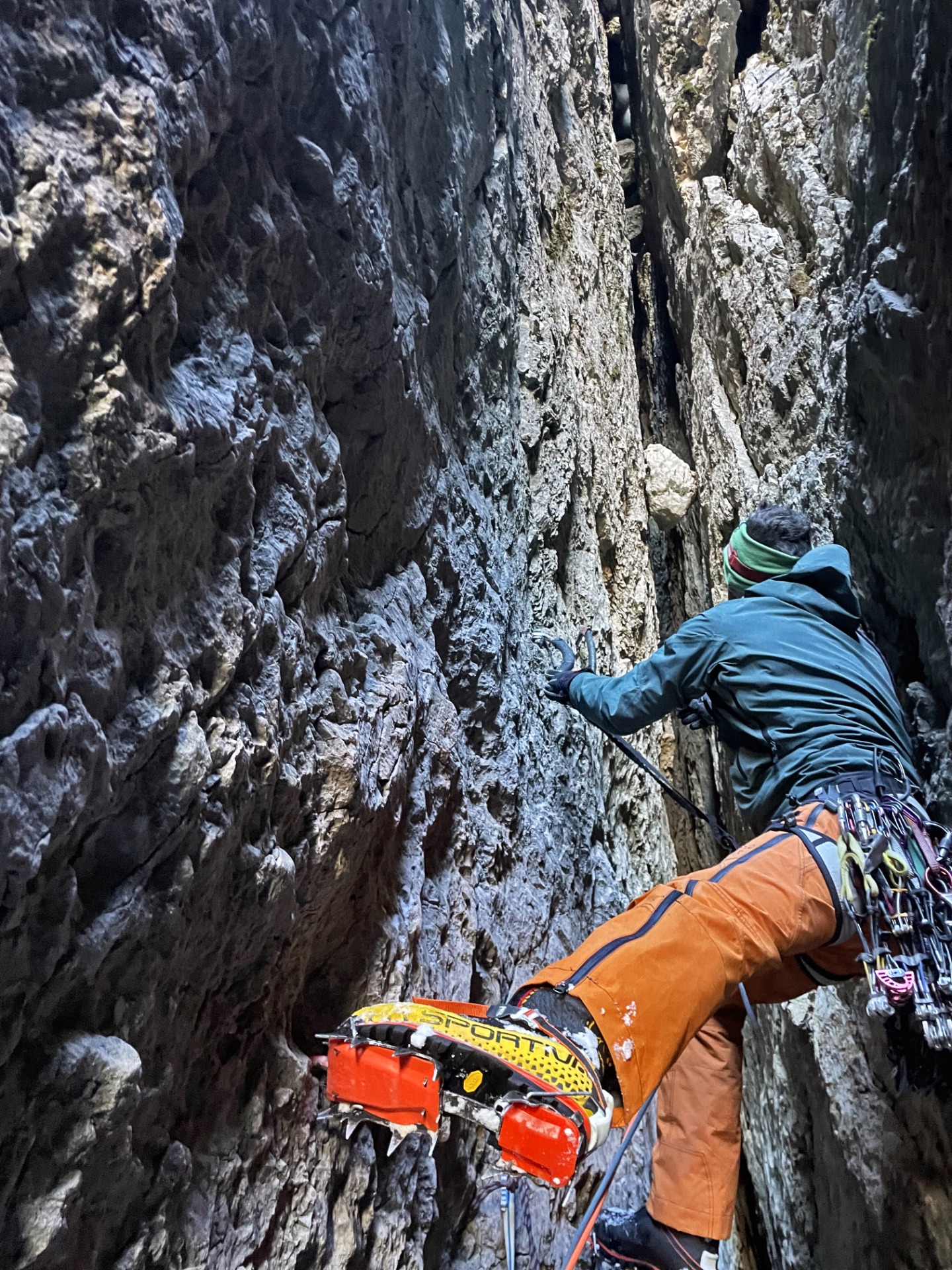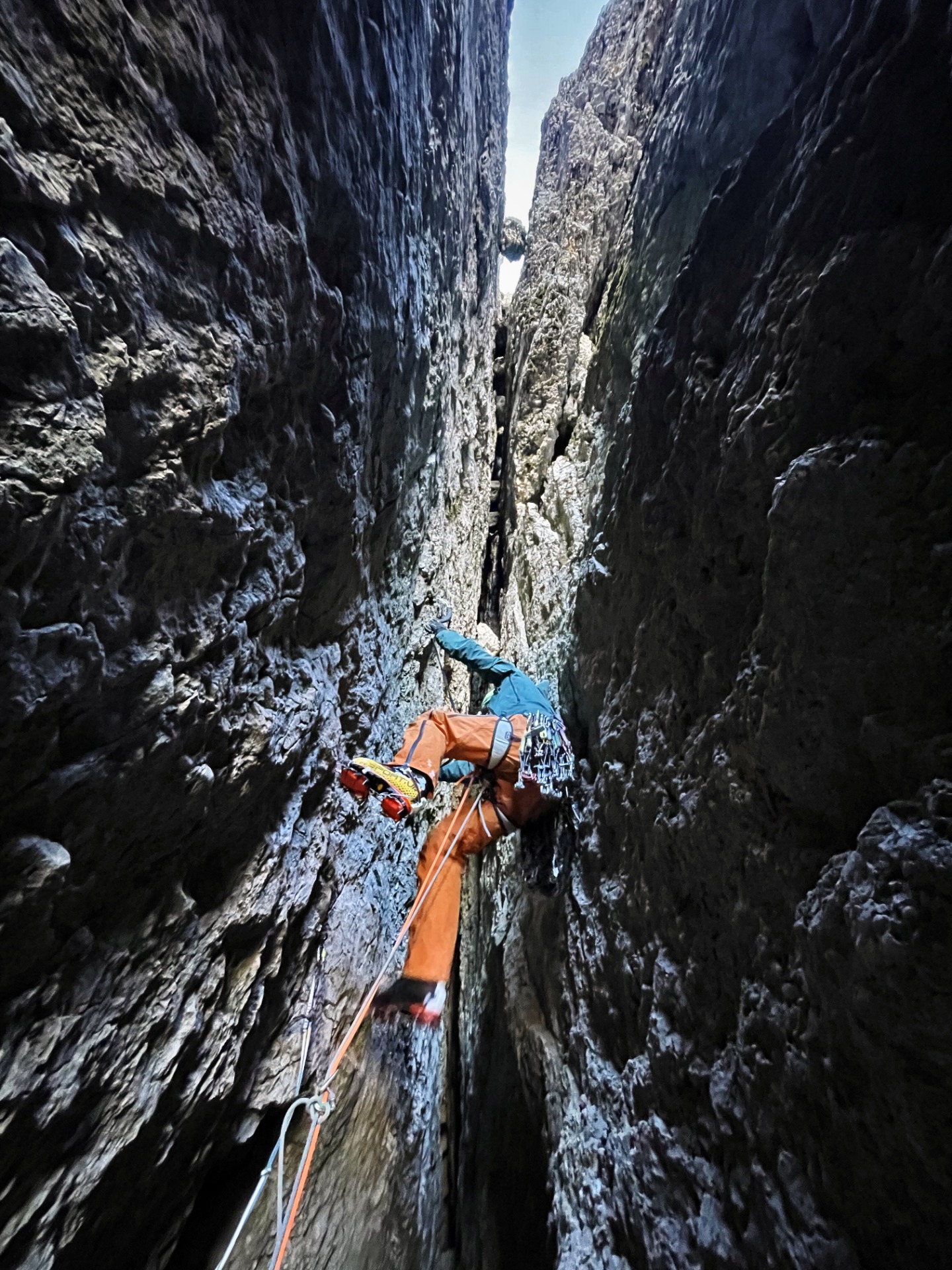 Misty Mountain si addentra letteralmente dentro le viscere della montagna e per alcuni tiri è stato necessario usare la frontale in pieno giorno. In un angusto e buio labirinto di sassi incastrati, l'esito è stato incerto fino all'ultimo metro e ci ha lasciato dentro un profondo senso di avventura. Per quanto non sia ne tra le più lunghe e ne tra le più difficili, dal punto di vista dell'avventura e dell'esplorazione è stata una delle più intriganti della mia vita.